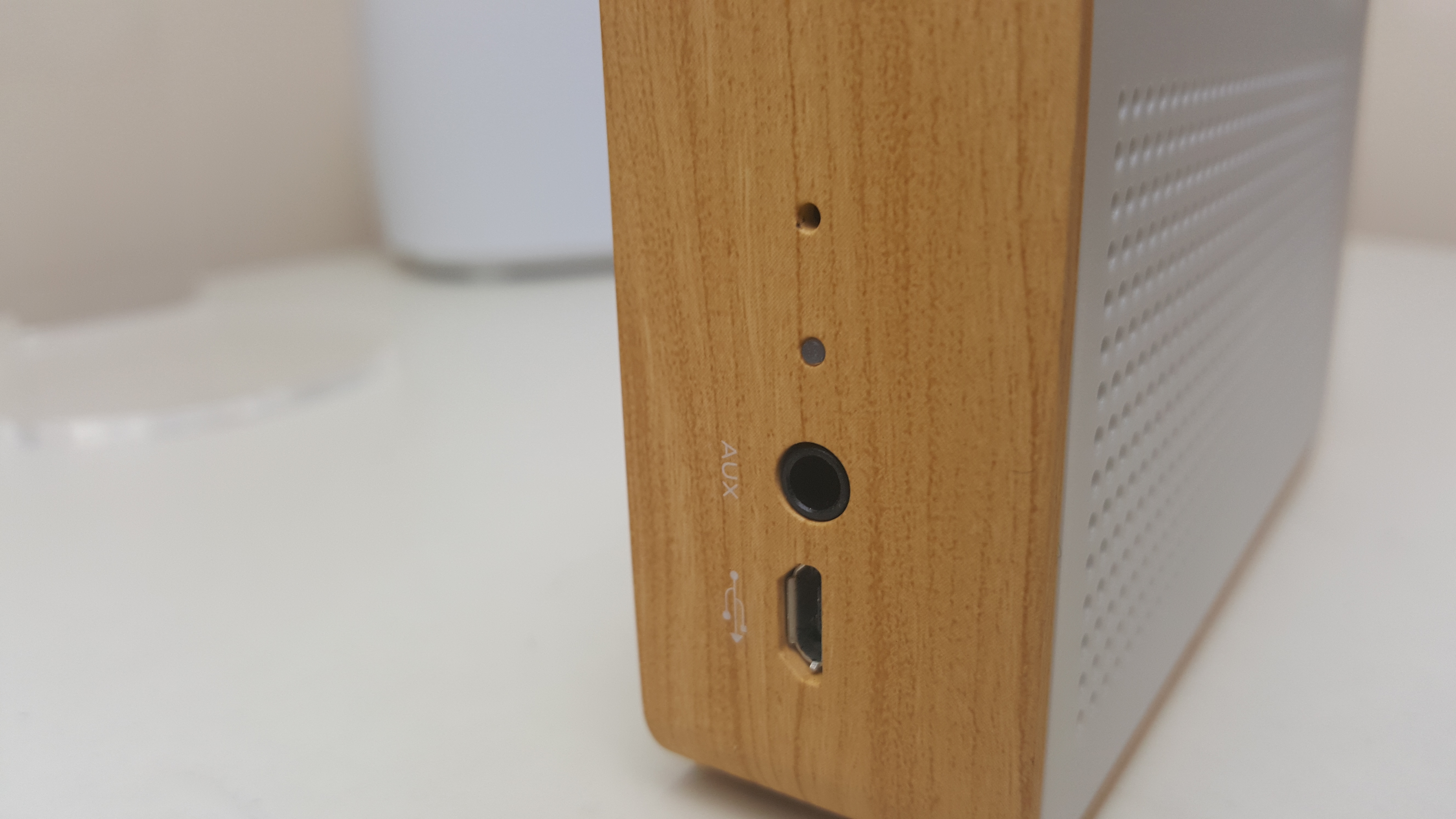 It features a wooden banding that covers over a white plastic front and back. On top you will find a metal knob that is used to power it, volume up and down and even to set up a Bluetooth connection. On the side you will find an auxiliary input for hard wiring Bluetooth devices to it and a charging port for the included microUSB. However, you don’t get a USB plug adapter in the box so you’d need one handy, unless of course you’re happy with charging through your laptop or desktop.