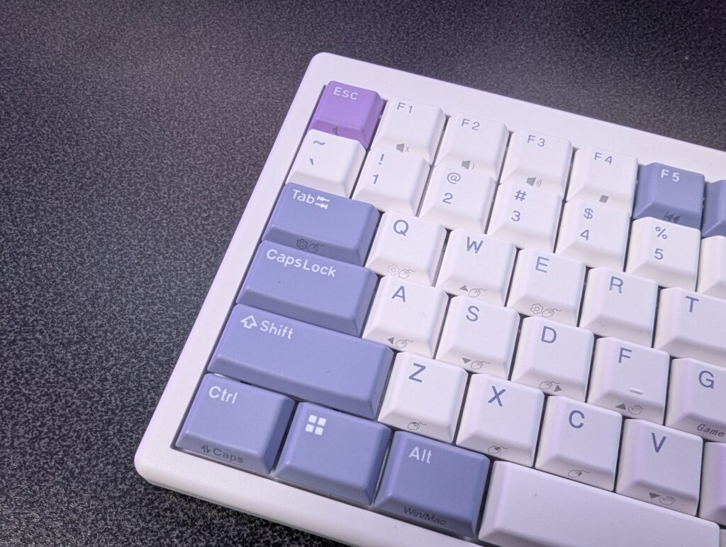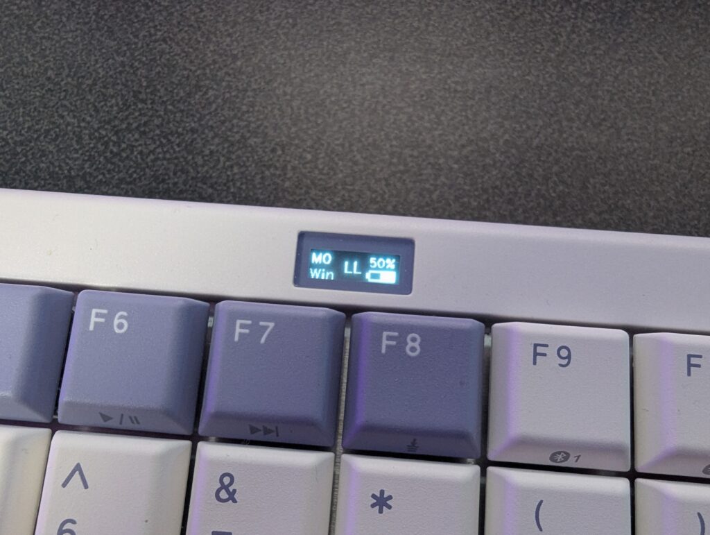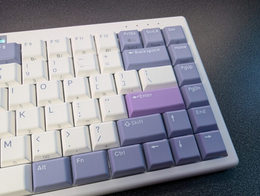 Along with this, there is an incredibly high polling rate that can be changed, from 1000, right through to 8000Hz, and again this is done inside of the software based on how you’re connecting the keyboard to your desktop, as there’s a tri-connectivity being Bluetooth, a 2.4GHz dongle or a USB Type-C cable which is included, which is also needed to charge the battery, of which so far I’ve managed a week or so but NIZ claim a battery life of 200 hours which is insane. With room to spare. There’s a power button which is tiny on the back left of the keyboard, and to tie it all together, it has some lovely accented keys and rounded corners. There’s a small screen that’ll give you your prompts on which keyboard type you’re using, being Windows or Mac, your battery indicator and your chosen connectivity type. Pretty simple stuff but nice and effective. What is crazy though is the fact it can connect up to seven devices wirelessly so you can seamlessly use your keyboard between each device thanks to its Bluetooth 5.2 connection. Inside of the box, you’ve got some spare keycaps if you want to change it to a Mac setup, and the keycaps double-shot PBT with a really nice and clear font.