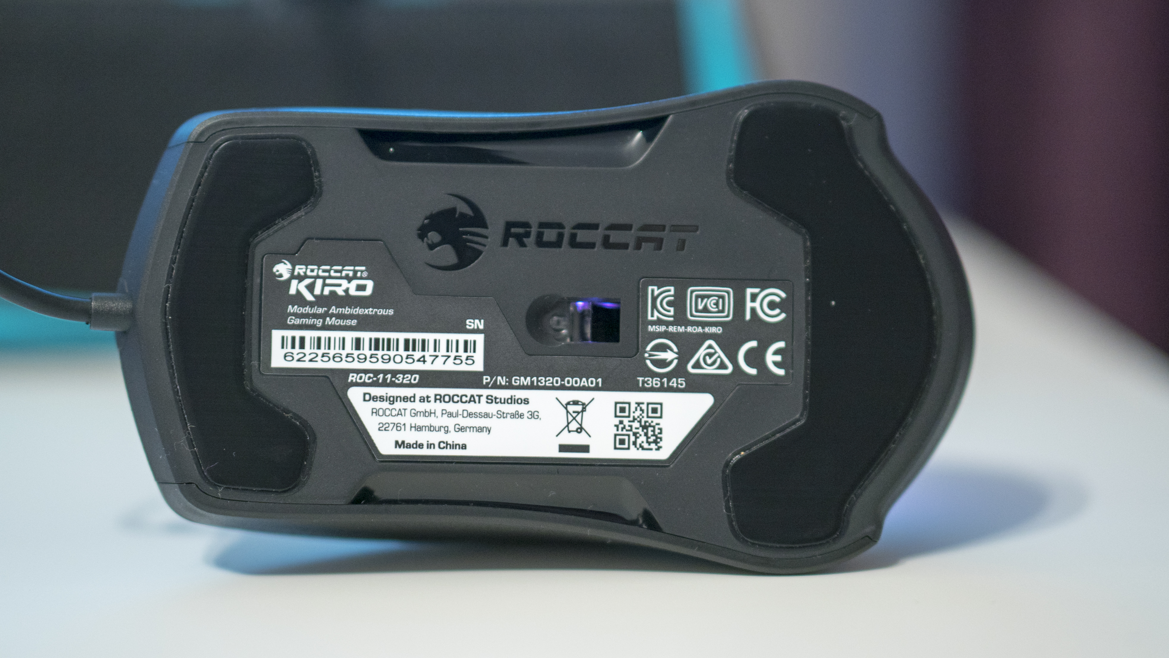 The entire mouse is made from plastic, shaded differently from black to grey. It’s not the kind of mouse that’s going to turn heads when you take it to a LAN party to use and probably won’t impress your friends as it doesn’t have a million lights glowing from it. It does however have a dim glow where the Roccat Kiro sign is under the palm rest which looks quite classy. This is RGB so you can at least customise it to match your setup. I’m using the Roccat Skeltr as my main keyboard driver at the moment and have both devices set to a blue colour.