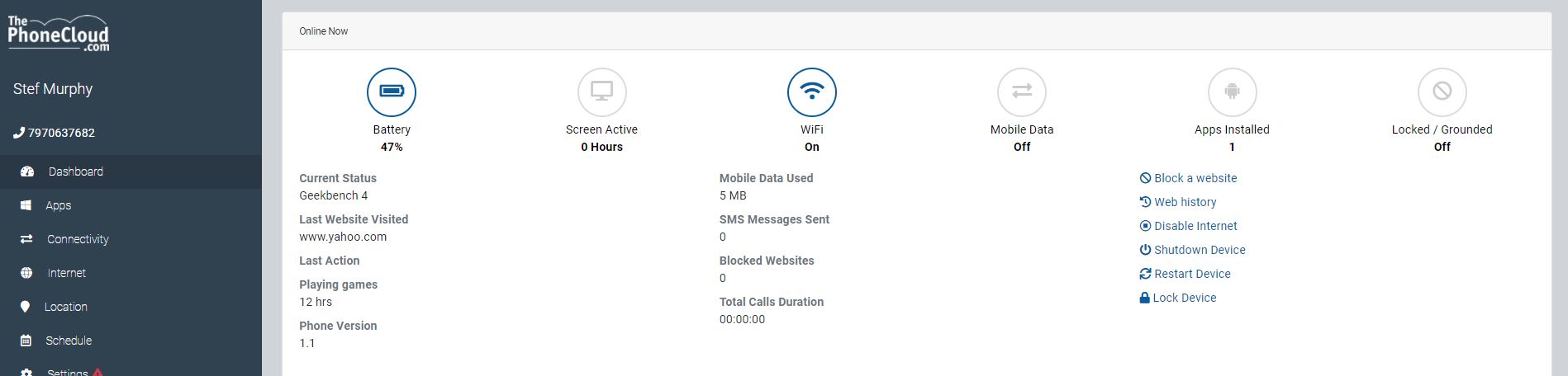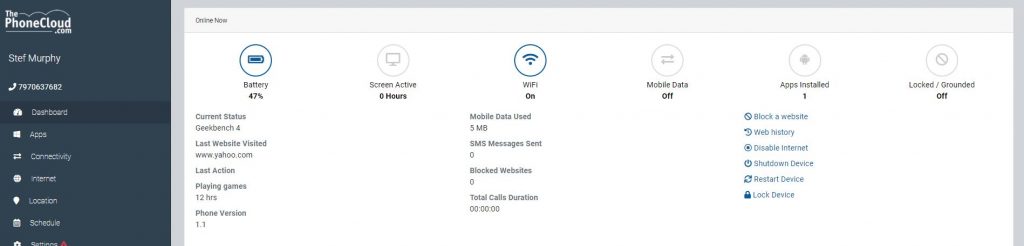 I would show you more but below that snipping is a large GPS map, and I want to protect myself as much as possible. But as you can see you can literally check on everything your kid is getting up to on that device. You can even see the app that they are using. You can see that during this snipping I was running a Geekbench 4 website, and the last website that was visited on this handset was Yahoo. On the right you have other options like disabling internet access, blocking certain websites and look at web histories.