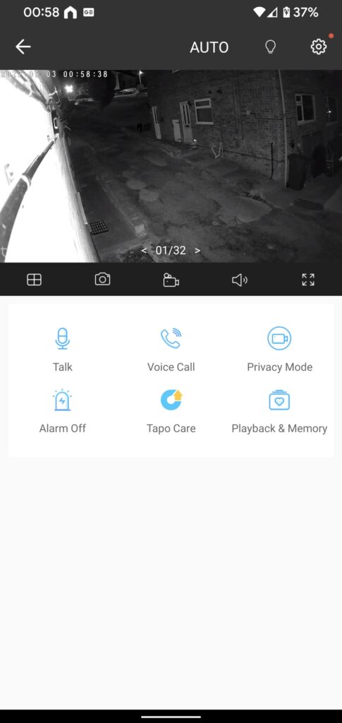 Once inside the Tapo app, I have access to what looks like up to 32 individual cameras, which is mental. If you’ve got a big enough place for 22 cameras, I’m sure it’ll look akin to a security room at a bank but for now, I’ve only got the one. The home screen stores your favourite products, and that’s where I can access my camera. Once selected, I’ve got full control of what my camera does. There’s a thumbnail view at the top, with options for taking screenshots and recordings and opening the other cameras. Under that I can use the built-in microphone to talk to people in front of the camera, from anywhere by the way as long as there’s an internet signal. I can make a voice call to the camera and even set of the alarm, which by the way sounds like a nuclear warning. It’s loud, and it’ll definitely deter a nighttime intruder.