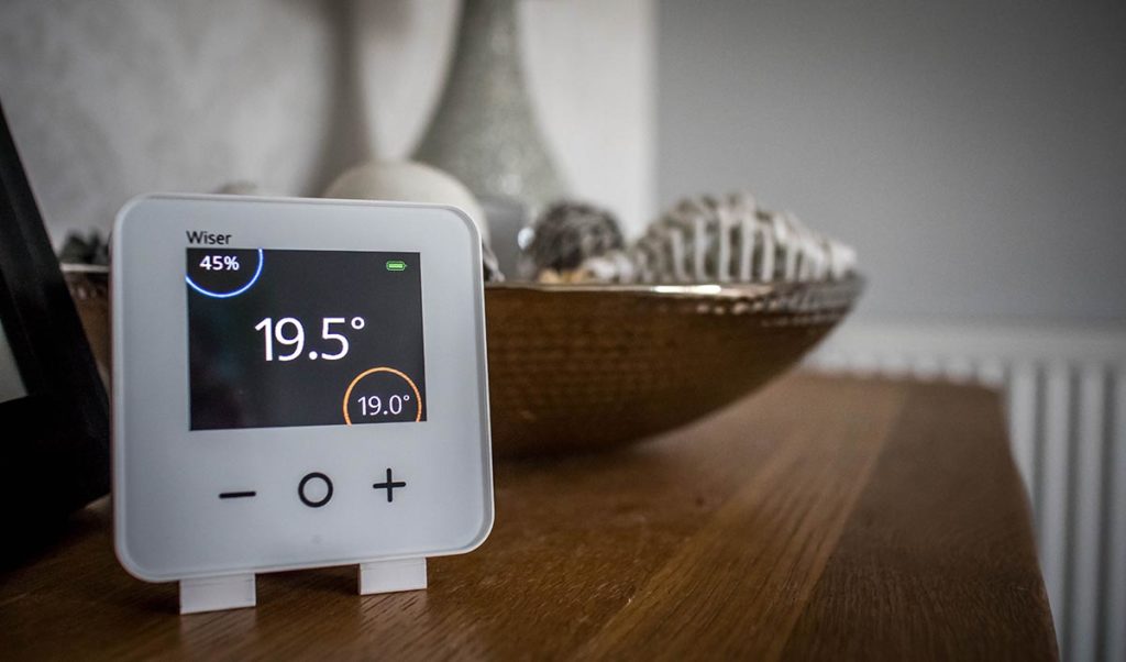– The Wiser Room Thermostat enables you to wirelessly control your heating from anywhere in the world via your smartphone with the Wiser App. This includes Eco & Away mode, plus Alexa integration and Geo-fencing.